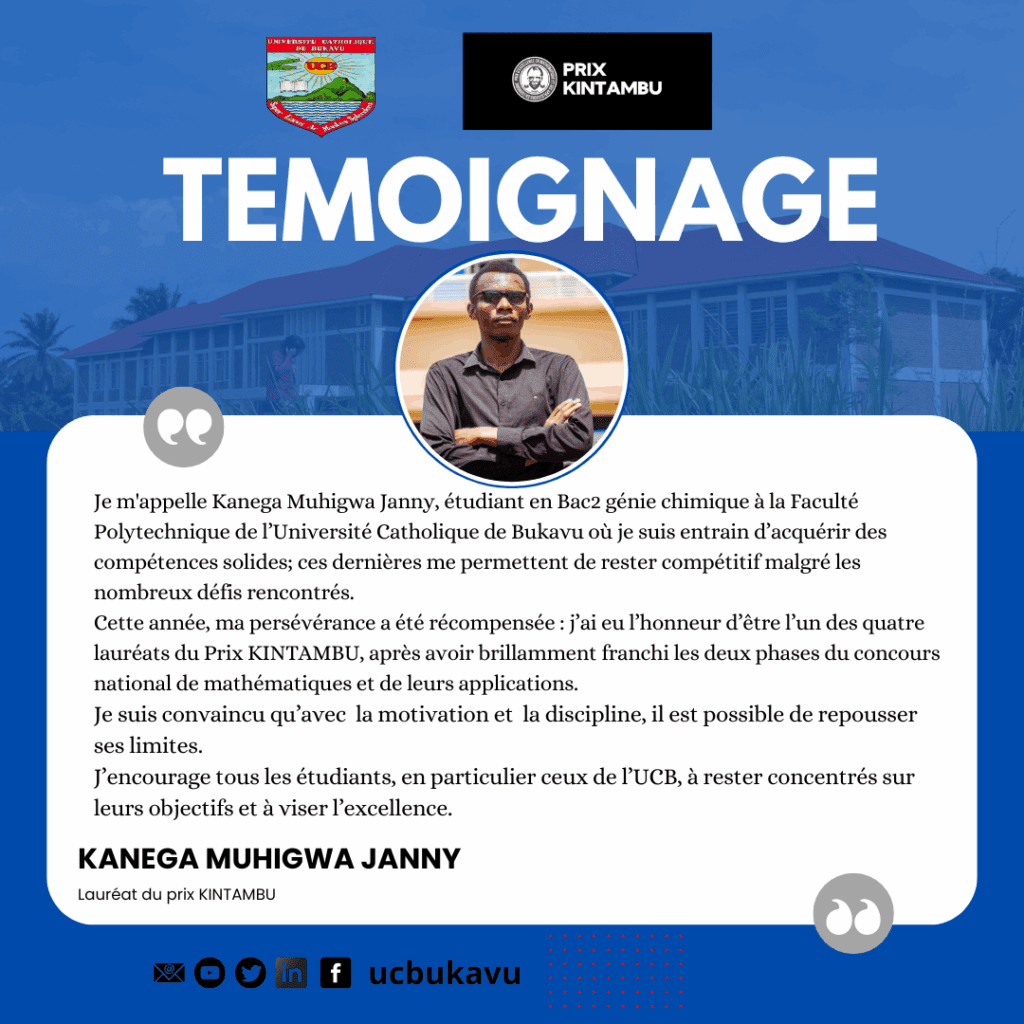 Nous tenons à vous encourager à poursuivre votre cursus académique à l’Université Catholique de Bukavu. Chaque étape de votre parcours est une occasion d’apprendre, de grandir et de contribuer à notre communauté. Ne laissez pas les défis vous décourager ; saisissez plutôt chaque opportunité pour développer vos compétences et élargir vos horizons. Vos efforts sont essentiels pour bâtir un avenir prometteur, tant pour vous que pour notre société.