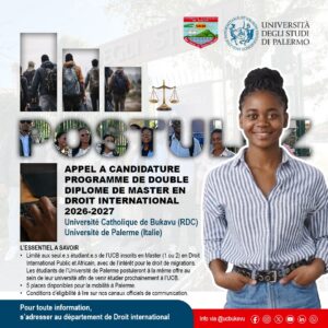 L’Université Catholique de Bukavu, en partenariat avec l’Université de Palerme (UNIPA) en Italie, a le plaisir d’annoncer l’ouverture officielle des candidatures pour son Programme de double diplôme de Master en Droit international pour l’année académique 2026-2027.